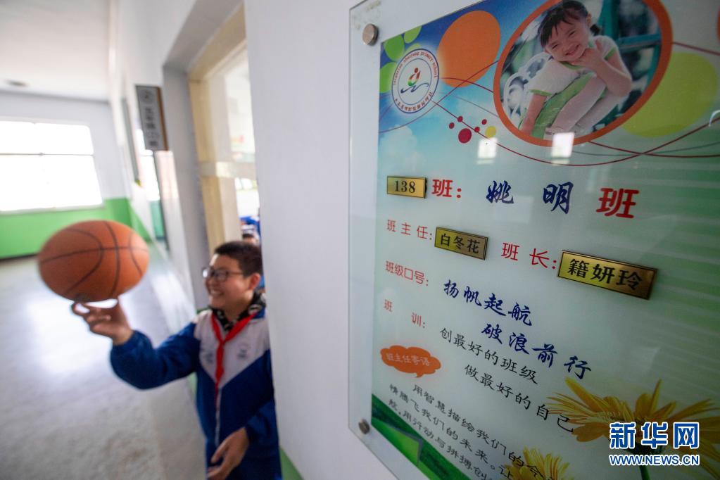 朝阳学校的学生在课后拿着篮球走出教室(4月14日摄)。新华社记者 杨晨光 摄