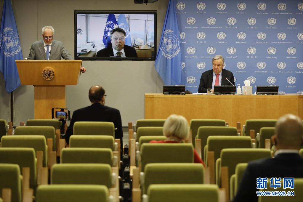 4月19日,联合国秘书长古特雷斯(右)在位于纽约的联合国总部与世界气象组织秘书长塔拉斯(屏幕中)共同出席新闻发布会。