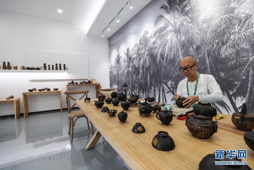 4月20日,匠人在博鳌亚洲论坛主题公园的展厅里制作椰雕。