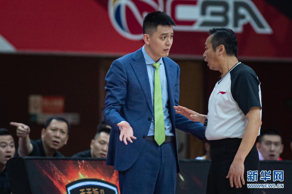 4月21日,辽宁本钢队主教练杨鸣(左)在比赛中与第一副裁判崔哲雄交流。