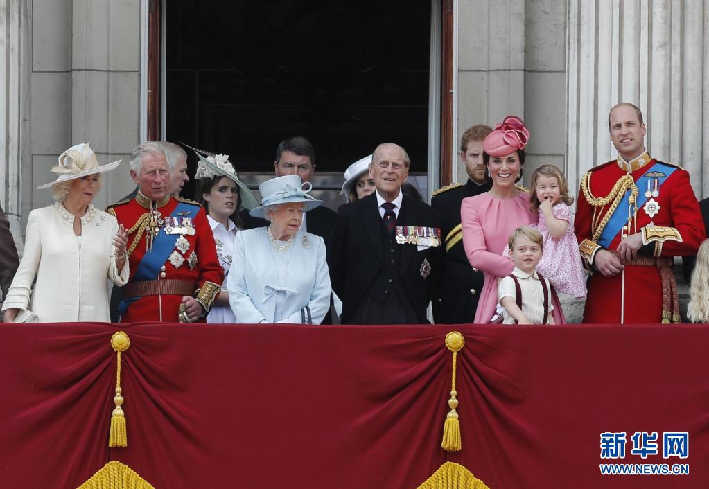 这张2017年6月17日拍摄的资料照片显示,英国女王伊丽莎白二世(前左三)与丈夫菲利普亲王(前左四)及其他英国王室成员在伦敦白金汉宫的阳台上准备观看飞行表演。新华社记者韩岩摄