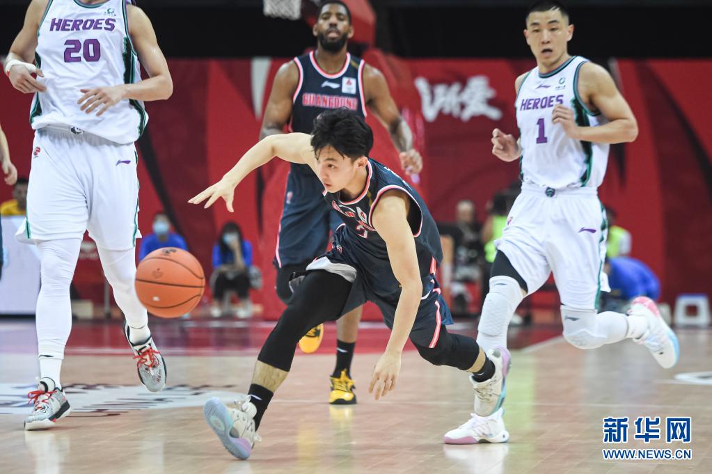 4月22日,广东东莞大益队球员徐杰(前中)在比赛中突破。 当日,在浙江诸暨举行的2020-2021赛季中国男子篮球职业联赛(CBA)季后赛半决赛中,广东东莞大益队以118比112战胜山东西王,以总比分2比0晋级总决赛。 新华社记者 江汉 摄