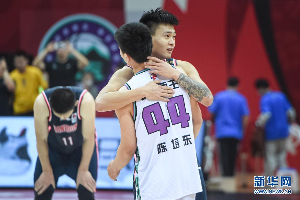 4月22日,广东东莞大益队球员赵睿(右)在比赛结束后拥抱安慰山东西王队球员陈培东。 当日,在浙江诸暨举行的2020-2021赛季中国男子篮球职业联赛(CBA)季后赛半决赛中,广东东莞大益队以118比112战胜山东西王,以总比分2比0晋级总决赛。 新华社记者 江汉 摄