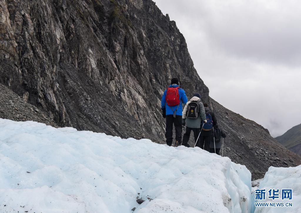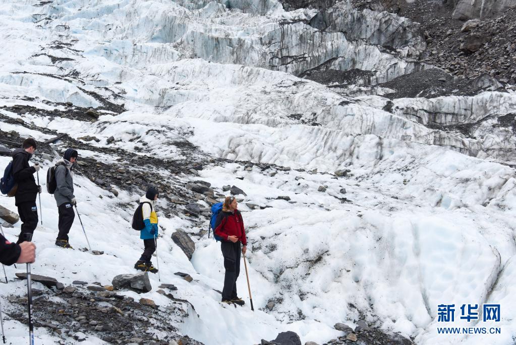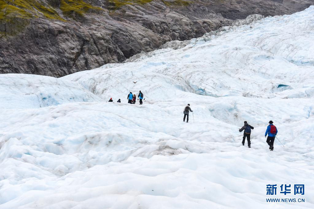 这是4月19日在新西兰南岛西海岸福克斯冰川上拍摄的景象。 福克斯冰川是新西兰南岛南阿尔卑斯山山脉重要的冰川,是新西兰著名旅游胜地。由于全球气候变暖,福克斯冰川过去十年大幅退化。 新华社记者 郭磊 摄