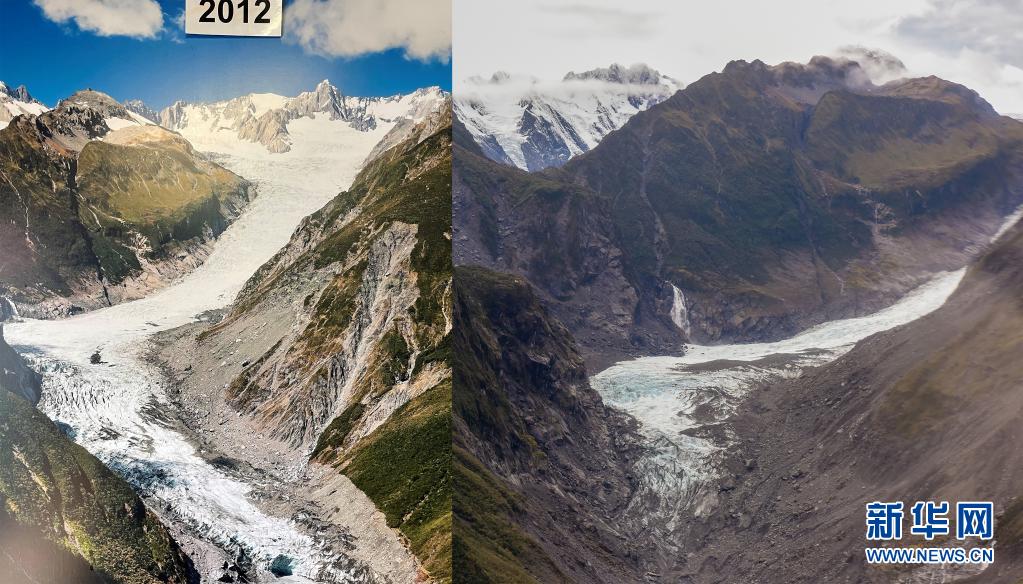 这张拼版图片显示的是2012年时的福克斯冰川全貌(左)和2021年4月19日航拍的福克斯冰川(右)。 福克斯冰川是新西兰南岛南阿尔卑斯山山脉重要的冰川,是新西兰著名旅游胜地。由于全球气候变暖,福克斯冰川过去十年大幅退化。 新华社记者 郭磊 摄 |