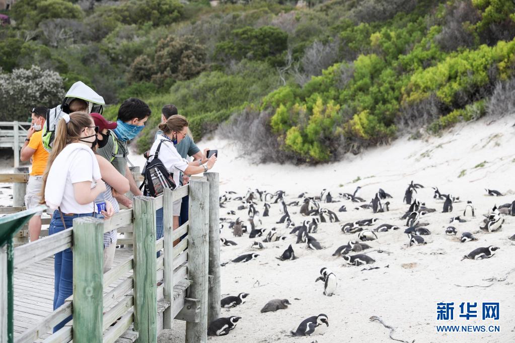 4月25日,游客在南非西蒙镇企鹅滩观赏非洲企鹅。