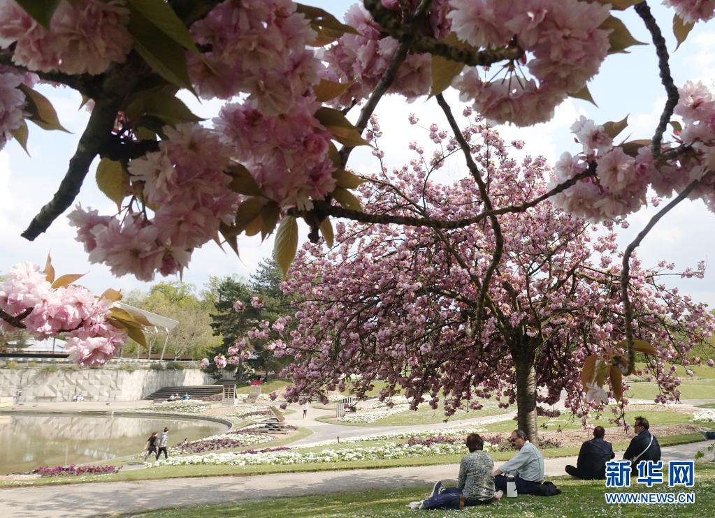 4月21日,人们在法国巴黎一处公园的樱花树下休闲。 近日,法国巴黎气温回升,春花开放,人们纷纷走出家门享受大好春光。 新华社记者 高静 摄