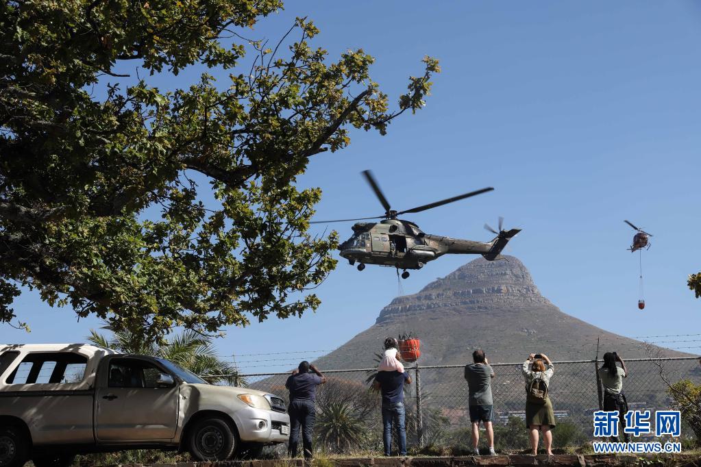 4月20日,在南非开普敦,人们围观参加灭火行动的军用直升机。 桌山位于非洲大陆最南端城市开普敦城区西部,是该市标志性自然景观。桌山国家公园东侧当地时间18日上午起火。据估计,火灾已破坏约400公顷植被。新华社记者 吕天然 摄