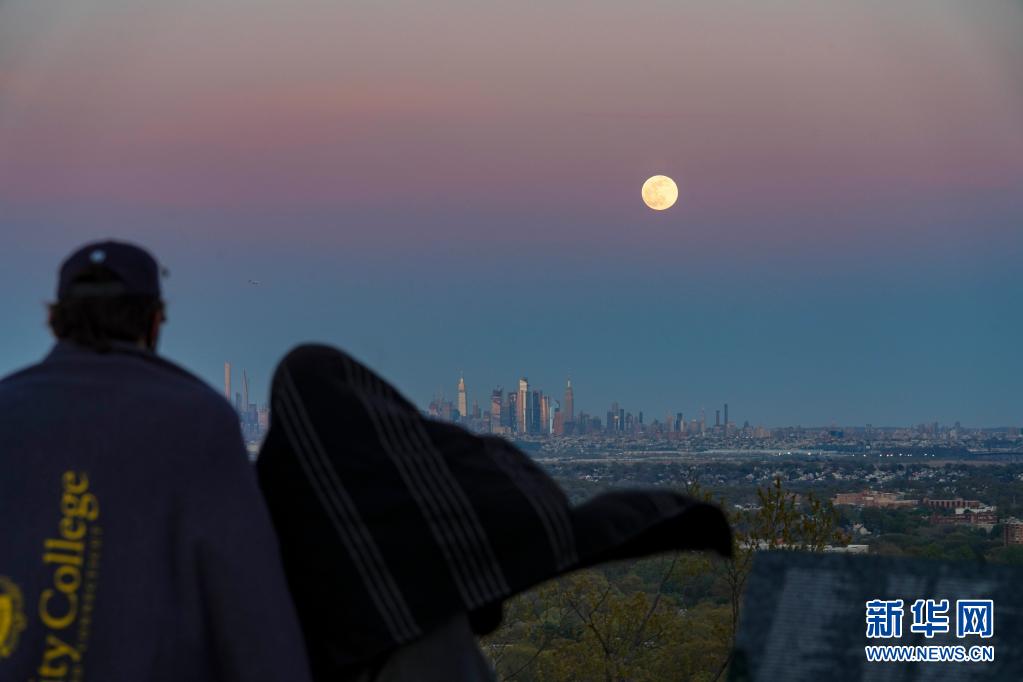 4月26日,人们在美国新泽西州西奥兰治观看“超级月亮”从纽约曼哈顿的天际线上升起。