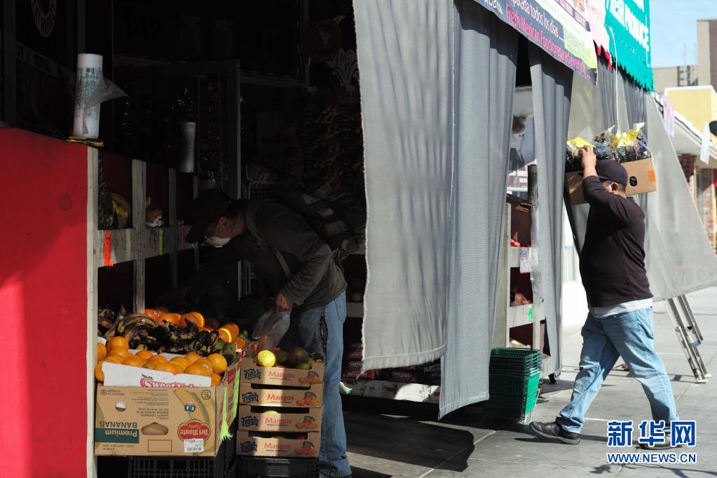 4月26日,一名男子(左)在美国加利福尼亚州北部小城圣马特奥的一家商店选购水果。 美国加利福尼亚州共有四级防疫等级,从高至低依次为“紫、红、橙、黄”。美国加州旧金山湾区目前全部处于“橙色”或“红色”等级。圣马特奥市所在的旧金山湾区圣马特奥县处于“橙色”等级。 新华社记者 吴晓凌 摄