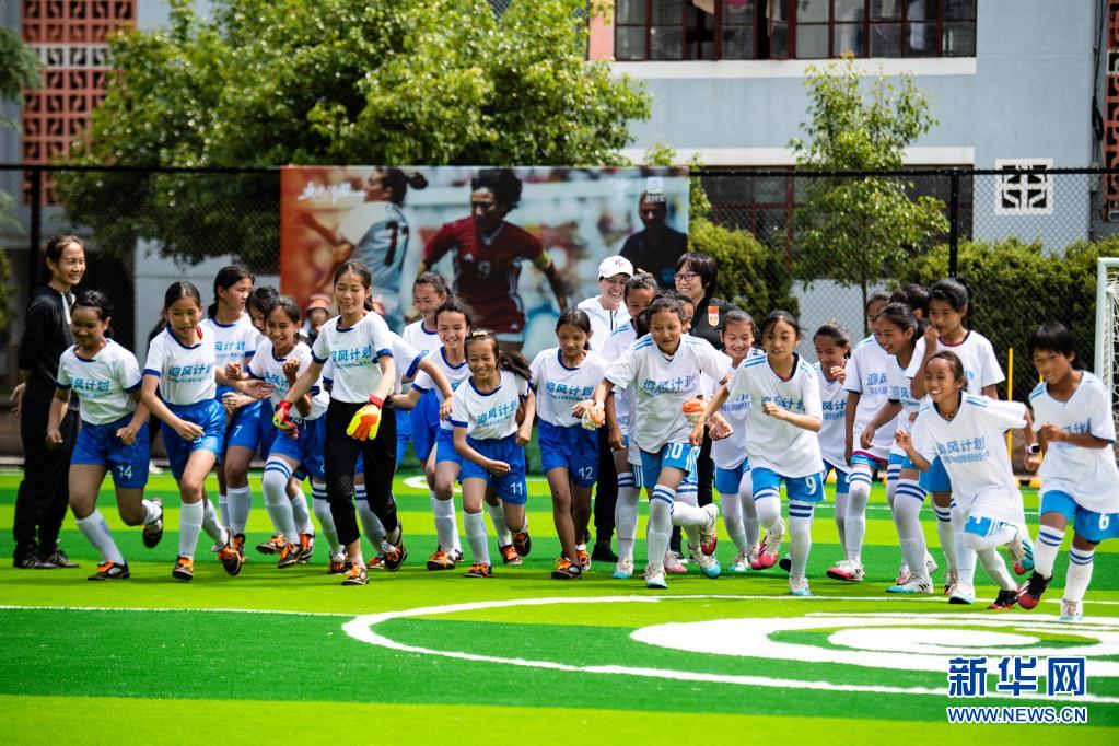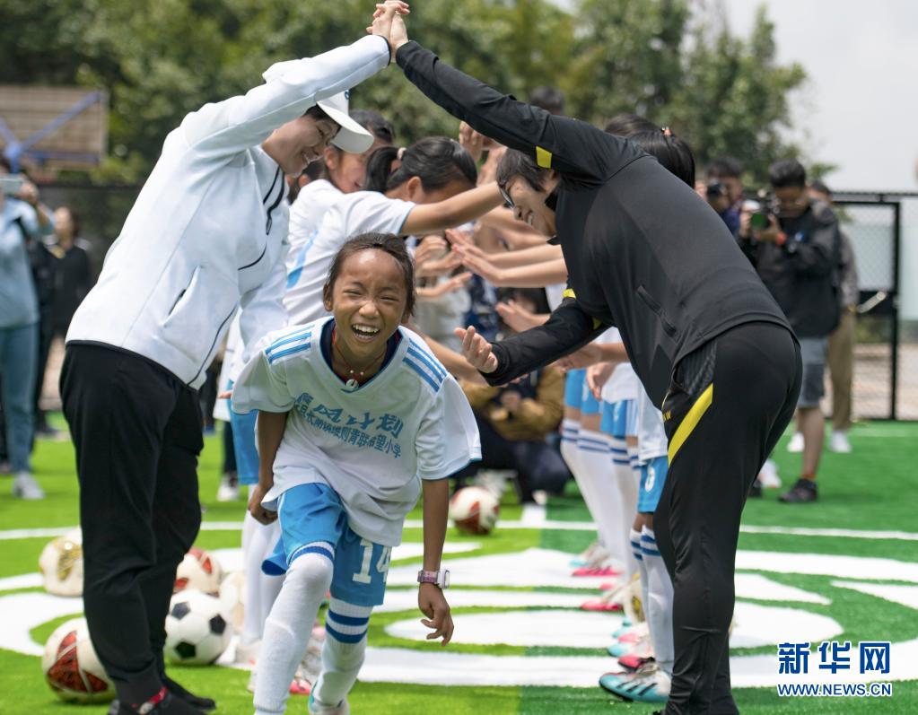 4月28日,中国足协副主席孙雯(前右)、前女足队员刘爱玲(前左)在主题球场与小队员们进行热场活动。 当日,首个中国女足主题球场在云南省昆明市石林彝族自治县长湖镇维则青联希望小学建成启用。 新华社记者 王冠森 摄