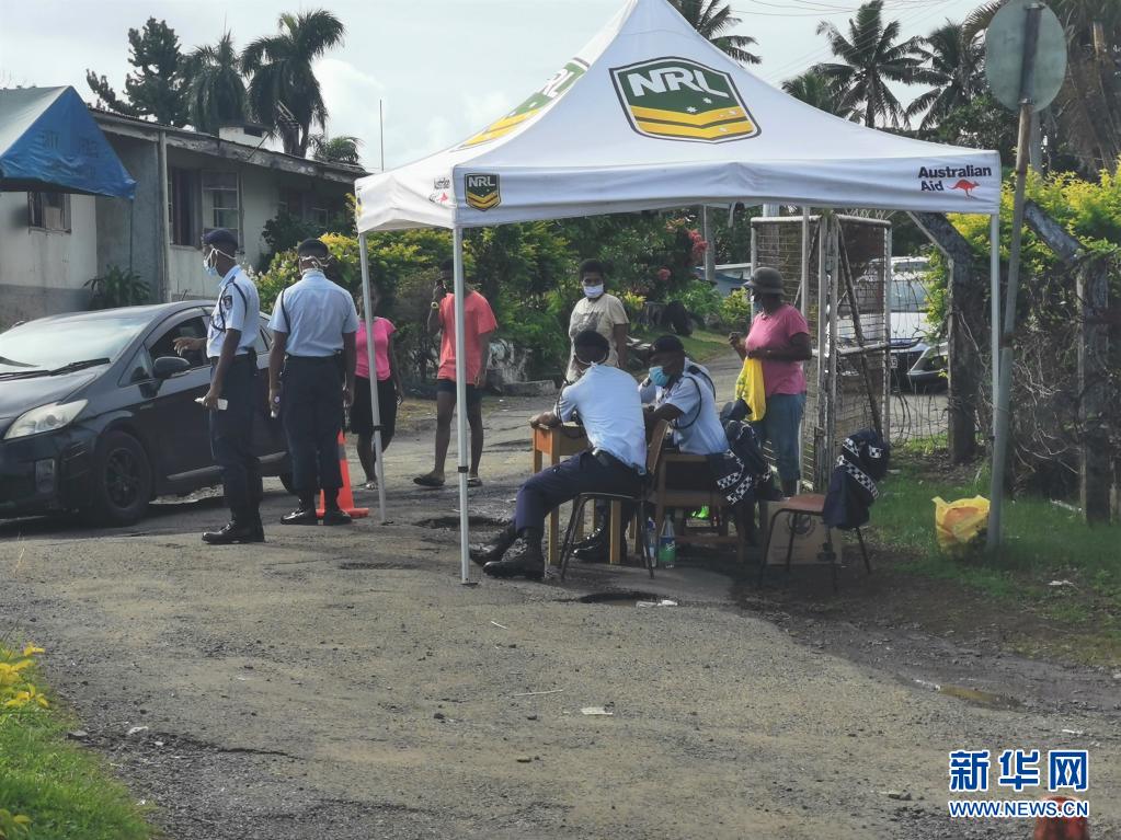 4月29日,警方在斐济苏瓦一社区的检查站检查过往车辆与人员。 斐济连日来新冠疫情持续恶化,为进一步查清传染源头、遏制疫情传播,斐济政府25日宣布首都苏瓦及周边地区将从26日凌晨4时开始实施为期14天的全面封锁。 新华社记者 张永兴 摄