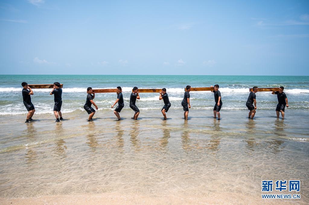 中国交通建设集团有限公司(中国交建)马来西亚东海岸铁路项目应急救援队的队员们在马来西亚彭亨州关丹附近的一处海滩进行体能训练(4月10日摄)。