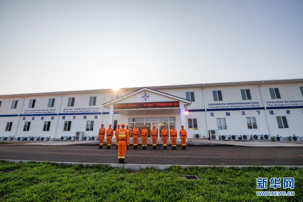 在中国交通建设集团有限公司(中国交建)马来西亚东海岸铁路项目总经理部关丹分址,项目应急救援队的队员们集合晨练(4月10日摄)。 新华社记者 朱炜 摄