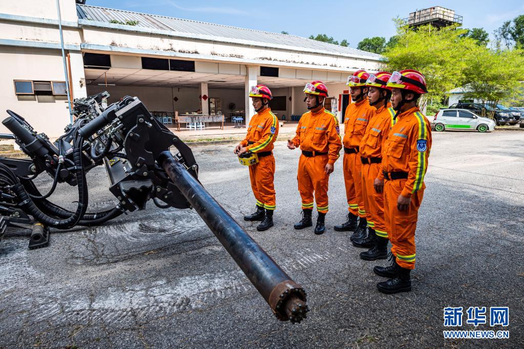 中国交通建设集团有限公司(中国交建)马来西亚东海岸铁路项目应急救援队的队员们在马来西亚彭亨州甘邦的营地进行用于打通救援生命通道的快速钻机科目训练(4月10日摄)。 新华社记者 朱炜 摄
