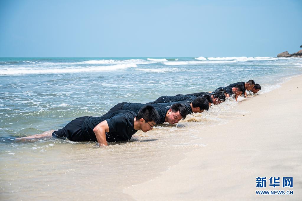 中国交通建设集团有限公司(中国交建)马来西亚东海岸铁路项目应急救援队的队员们在马来西亚彭亨州关丹附近的一处海滩进行体能训练(4月10日摄)。 新华社记者 朱炜 摄