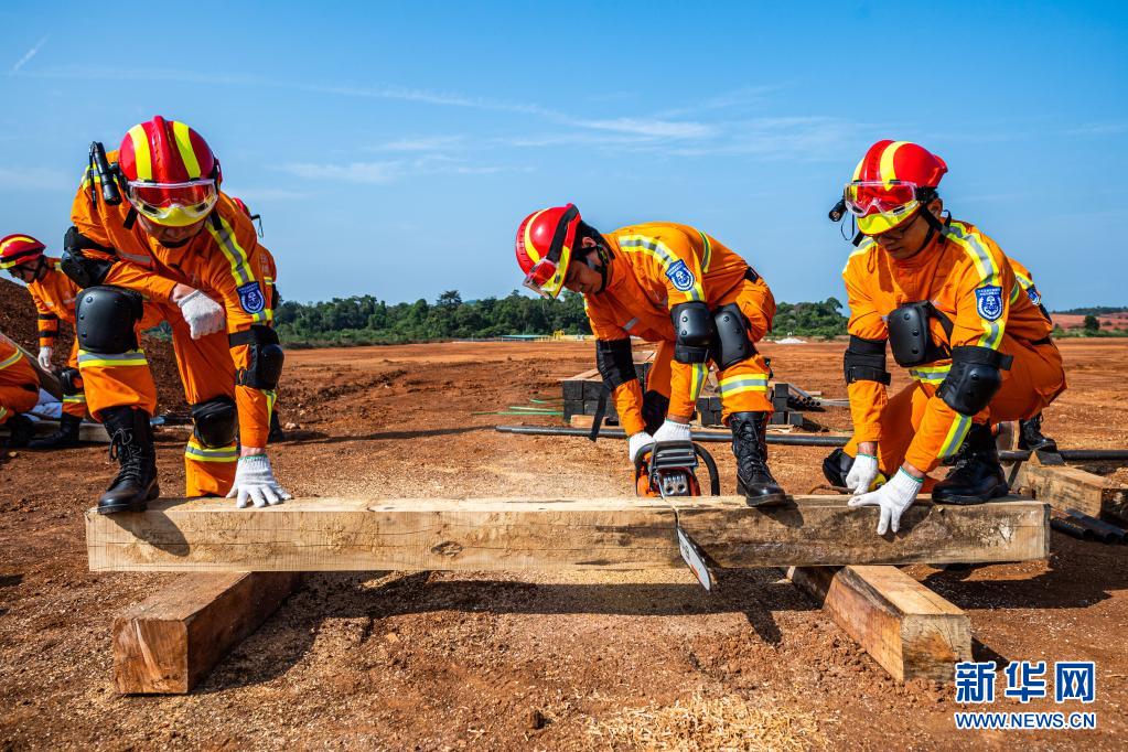 在中国交通建设集团有限公司(中国交建)马来西亚东海岸铁路项目总经理部关丹分址,项目应急救援队的队员们进行小导坑项目训练(4月10日摄)。