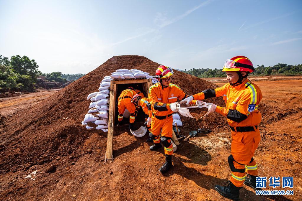 在中国交通建设集团有限公司(中国交建)马来西亚东海岸铁路项目总经理部关丹分址,项目应急救援队的队员们进行小导坑项目训练(4月10日摄)。