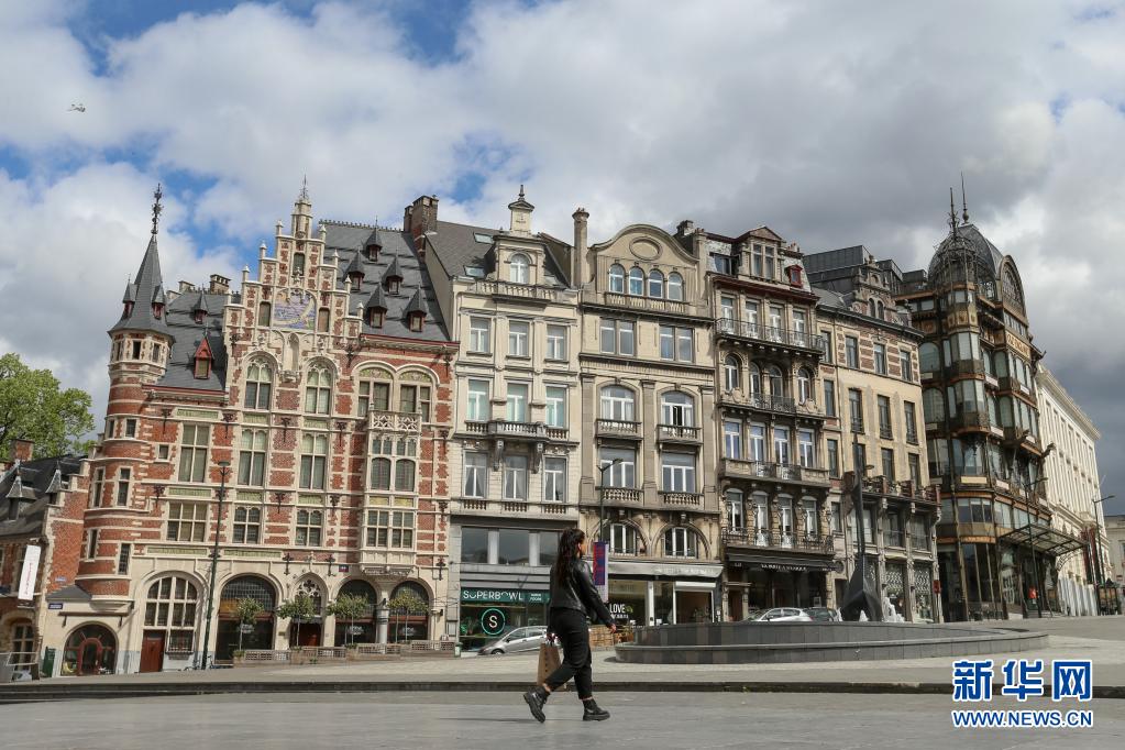 5月4日,一名女子在比利时布鲁塞尔街头行走。