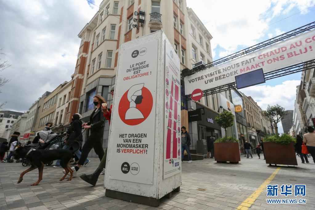 5月4日,人们走过比利时布鲁塞尔商业街上一个佩戴口罩提示牌。 比利时国家公共卫生研究所5月6日发布的新冠疫情数据显示,该国累计确诊病例超过100万例,达1003746例。 新华社记者 郑焕松 摄