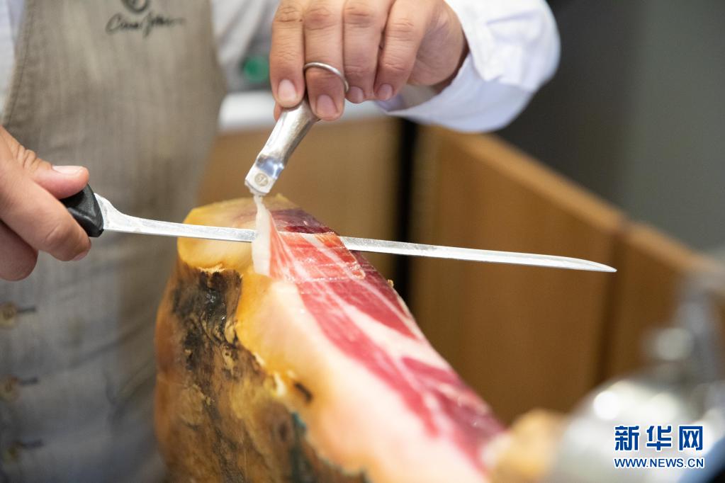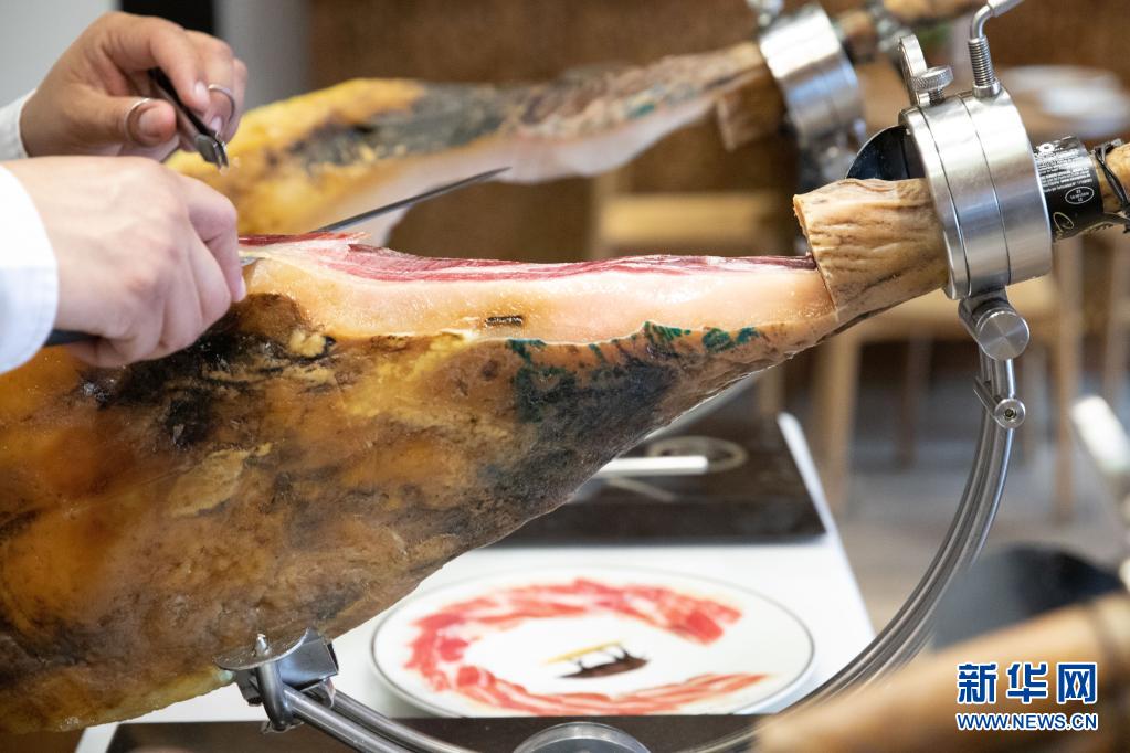 这是4月21日在西班牙马德里的一家餐馆拍摄的敖司堡集团5J火腿。 即将在中国海南海口举行的首届中国国际消费品博览会吸引众多全球知名品牌参展。西班牙敖司堡集团有关负责人日前对记者表示,该集团将携旗下多种旗舰产品亮相消博会,为中国消费者带来西班牙美食体验,进一步开拓中国市场。 新华社记者 孟鼎博 摄 这是4月21日在西班牙马德里的一家餐馆拍摄的敖司堡集团5J火腿。 即将在中国海南海口举行的首届中国国际消费品博览会吸引众多全球知名品牌参展。西班牙敖司堡集团有关负责人日前对记者表示,该集团将携旗下多种旗舰产品亮相消博会,为中国消费者带来西班牙美食体验,进一步开拓中国市场。 新华社记者 孟鼎博 摄