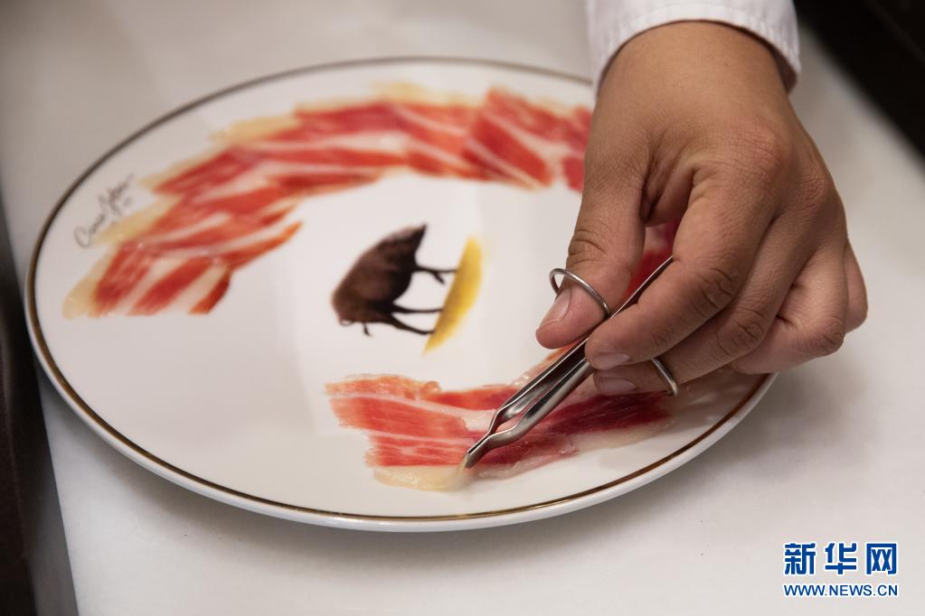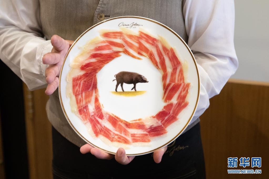 这是4月21日在西班牙马德里的一家餐馆拍摄的敖司堡集团5J火腿。 即将在中国海南海口举行的首届中国国际消费品博览会吸引众多全球知名品牌参展。西班牙敖司堡集团有关负责人日前对记者表示,该集团将携旗下多种旗舰产品亮相消博会,为中国消费者带来西班牙美食体验,进一步开拓中国市场。 新华社记者 孟鼎博 摄