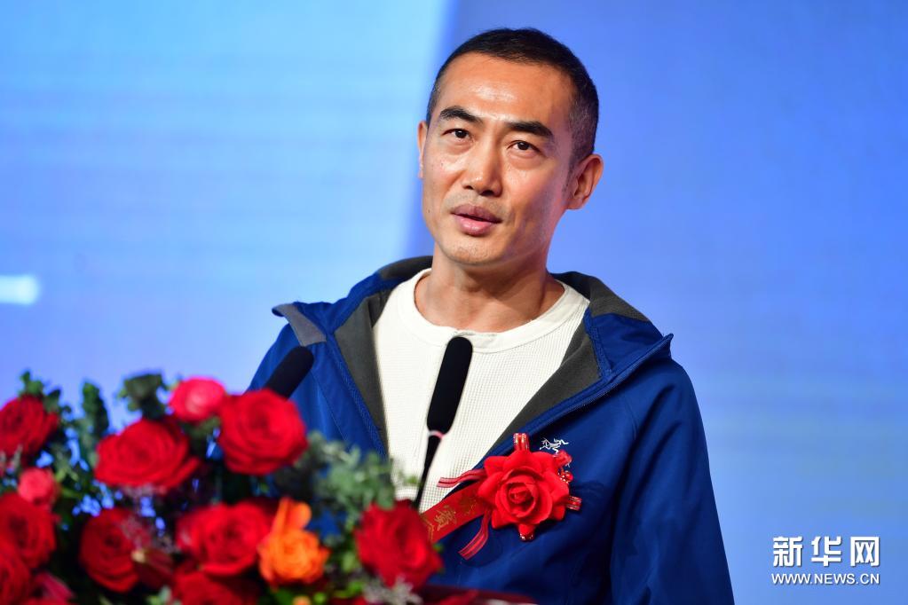 5月6日,饰演男主角的演员艾东在电影《高铁作证》开机仪式上发言。新华社记者 陈斌 摄
