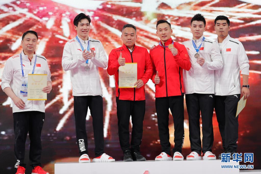 5月6日,湖南队选手张博恒(左二)及教练陈伟(左一)、北京队选手肖若腾(右三)及教练陈刚(左三)、福建队选手林超攀(右二)及教练王国庆在颁奖仪式上合影。