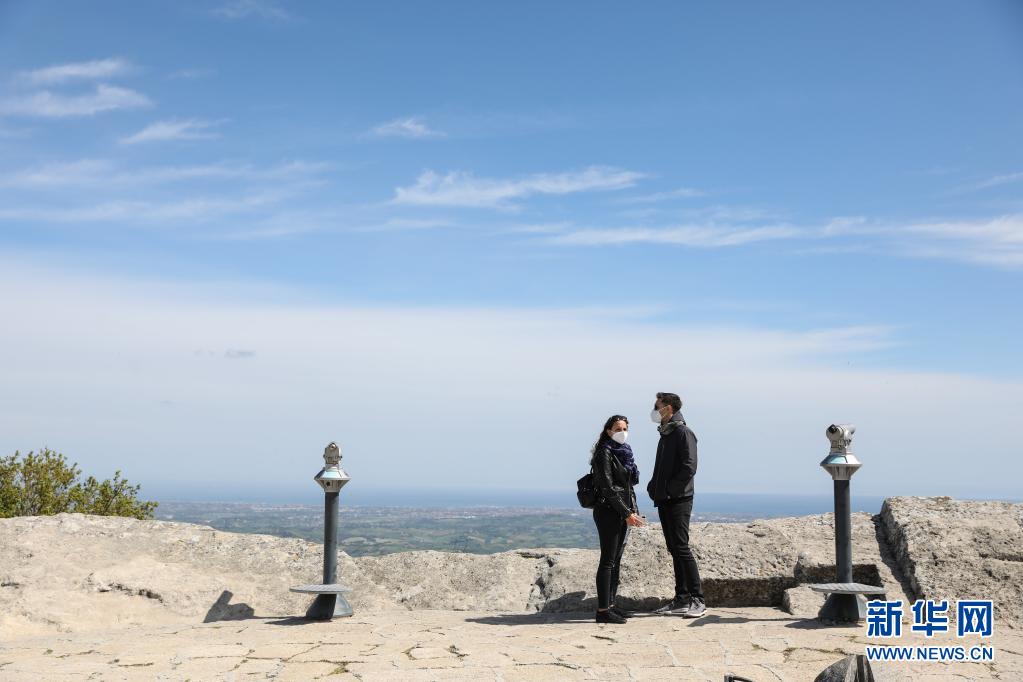 5月6日,人们在圣马力诺城中欣赏风景。 位于意大利境内的圣马力诺是欧洲最古老的共和国之一,它的面积约61平方公里,是知名的“国中之国”。 新华社记者 程婷婷 摄