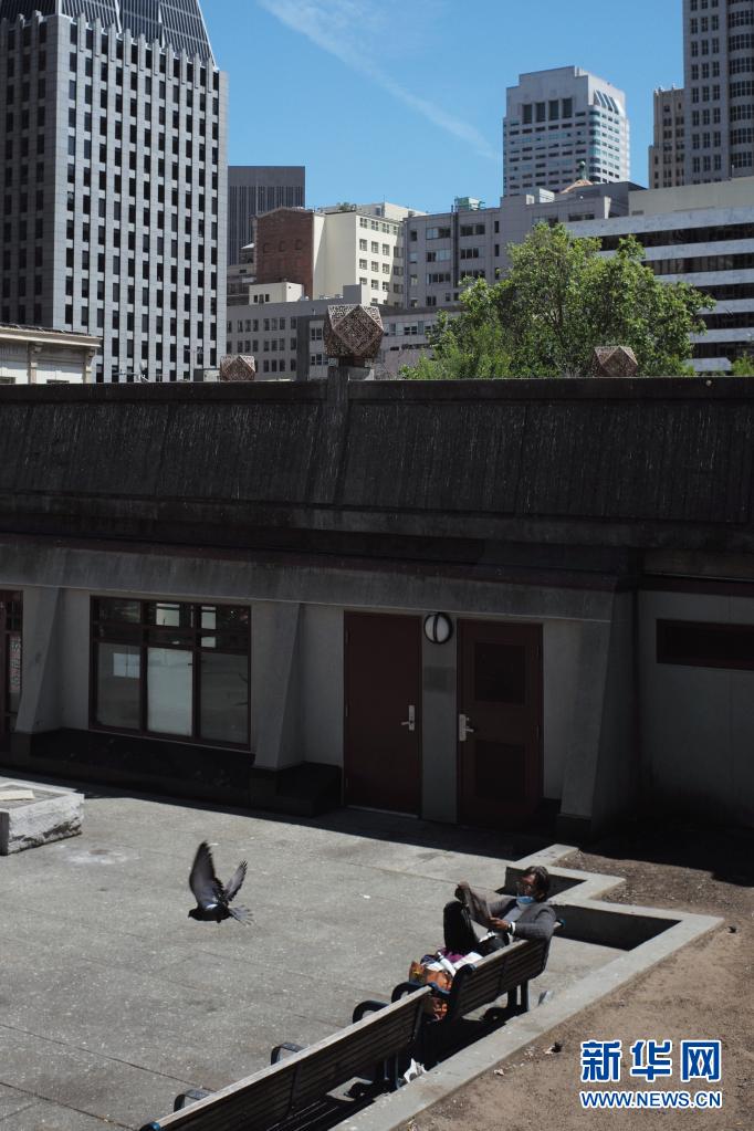 5月6日,在美国旧金山,一名男子坐在长椅上看报纸。