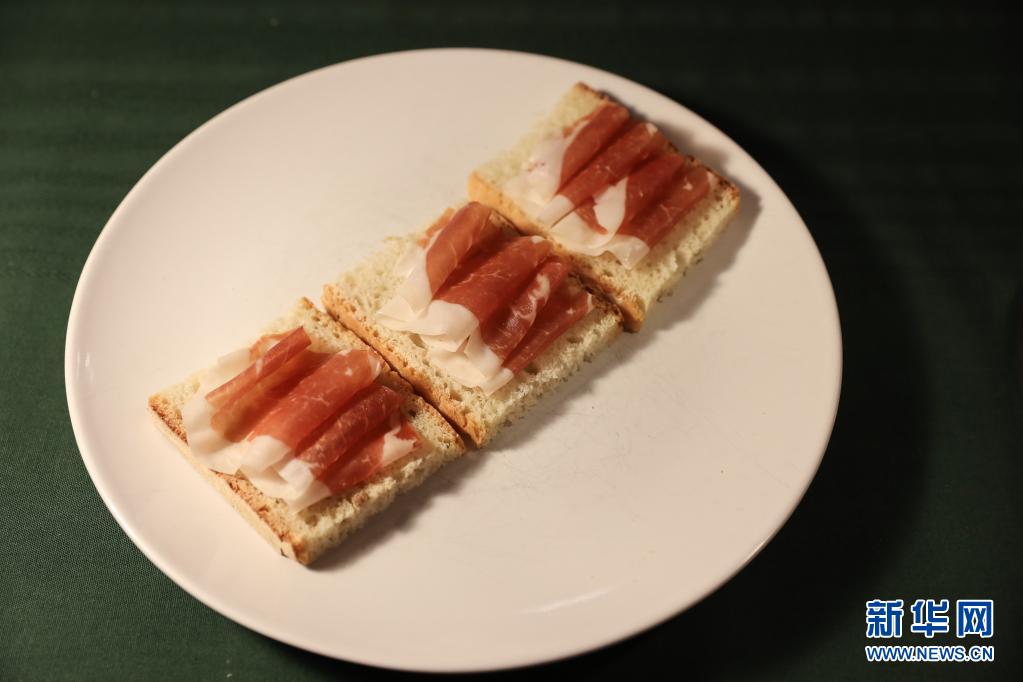 这是3月23日在意大利罗马拍摄的帕尔玛火腿和面包制做的前菜。
