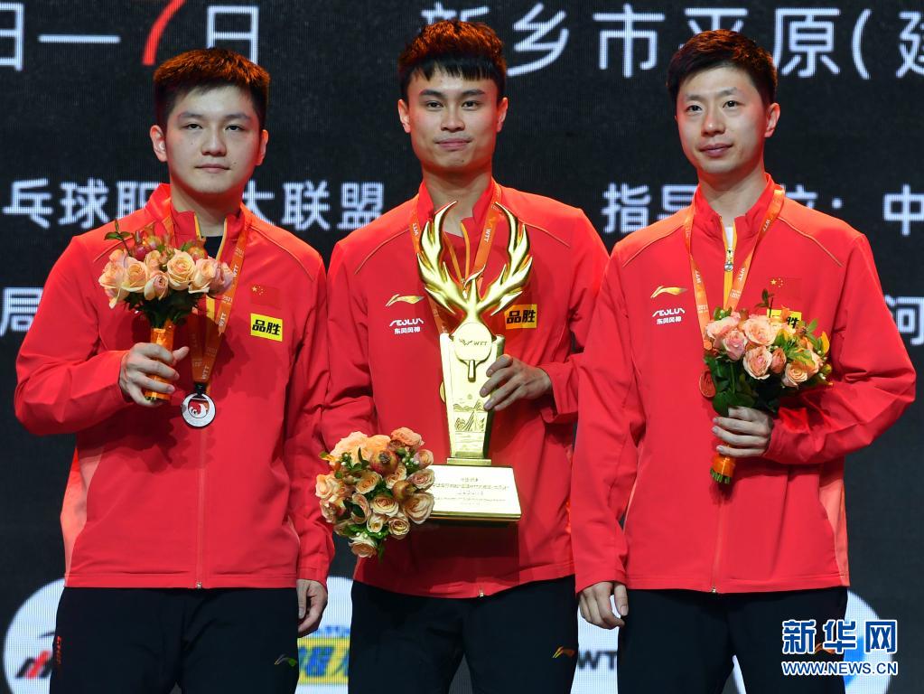 5月7日,冠军周启豪(中)、亚军樊振东(左)与季军马龙在颁奖仪式上。