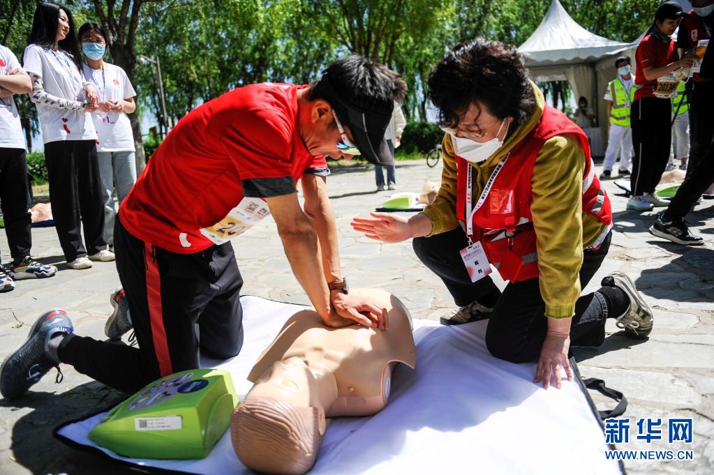 5月8日,参赛选手在比赛途中的任务点进行心肺复苏急救操作。 当日是世界红十字日,国内首个以应急救护为主题的团队式运动公益赛事——“红气球”定向越野赛暨京津冀应急救护达人大赛在北京通州城市绿心公园举办。此次公益活动由中国红十字基金会、北京市红十字会联合主办,来自全国各地的800余名队员组成的170余支队伍挑战徒步21公里,途中完成包括急救知识问答、心肺复苏急救操作等6项应急救护任务。本次活动旨在提高公众的应急救护能力。新华社记者 刘勇贞 摄