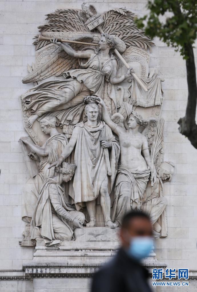 5月12日,一名男子戴口罩走在法国巴黎凯旋门附近。