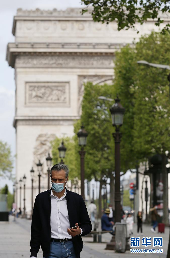 5月12日,一名男子戴口罩走在法国巴黎凯旋门附近。