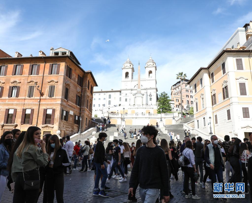 5月15日,游客在意大利首都罗马的西班牙广场上游览。 意大利16日正式对部分国家的游客开放边境。 新华社记者 程婷婷 摄