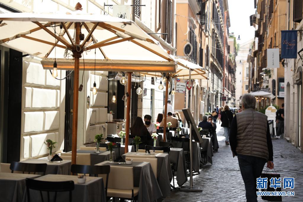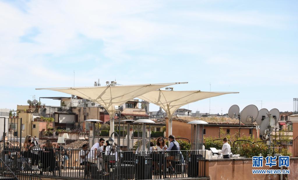 5月15日,人们在意大利首都罗马的西班牙广场附近餐厅用餐。 意大利16日正式对部分国家的游客开放边境。 新华社记者 程婷婷 摄
