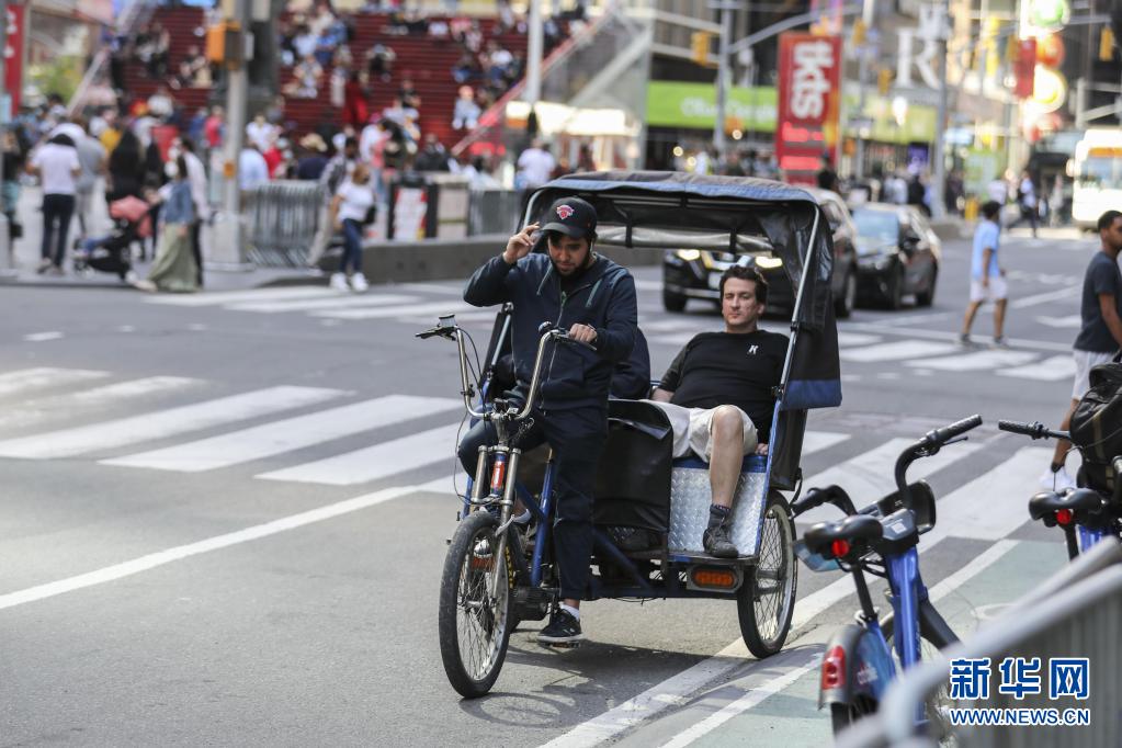 5月14日,游客乘坐人力车经过美国纽约时报广场。
