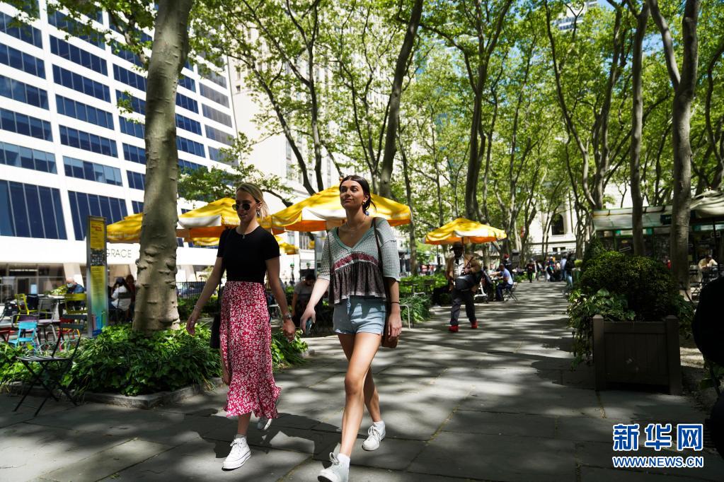5月14日,人们走在美国纽约布赖恩特公园内。 美国疾病控制和预防中心13日针对新冠疫情发布新指南,不再建议已完成新冠疫苗接种者参加室内、室外活动时戴口罩。 新华社记者 王迎 摄