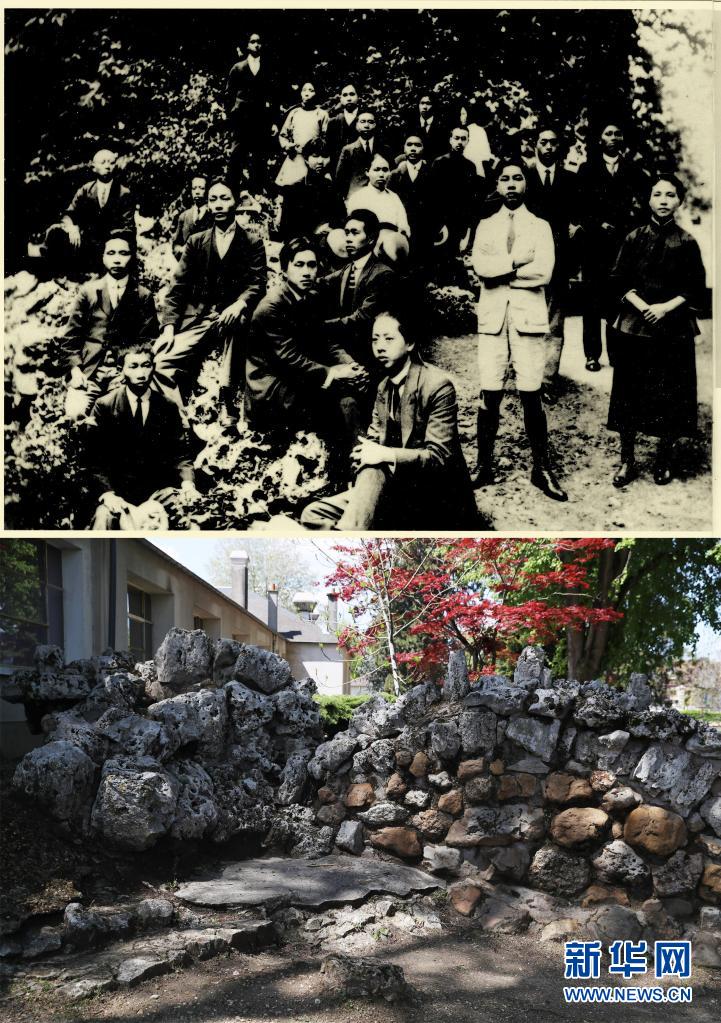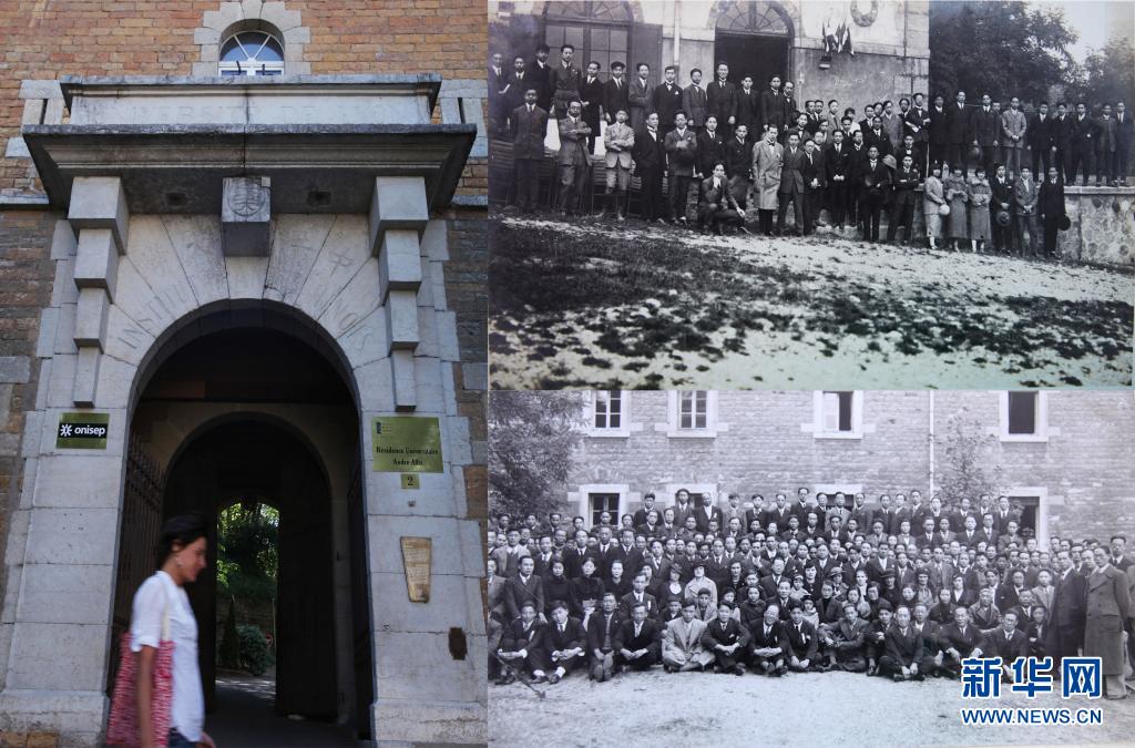 这张拼版照片显示的是法国里昂中法大学旧址(左图,摄于2011年4月26日)和旅法中国学生在里昂中法大学内合影的资料照片(右图)。 新华社记者 高静 摄
