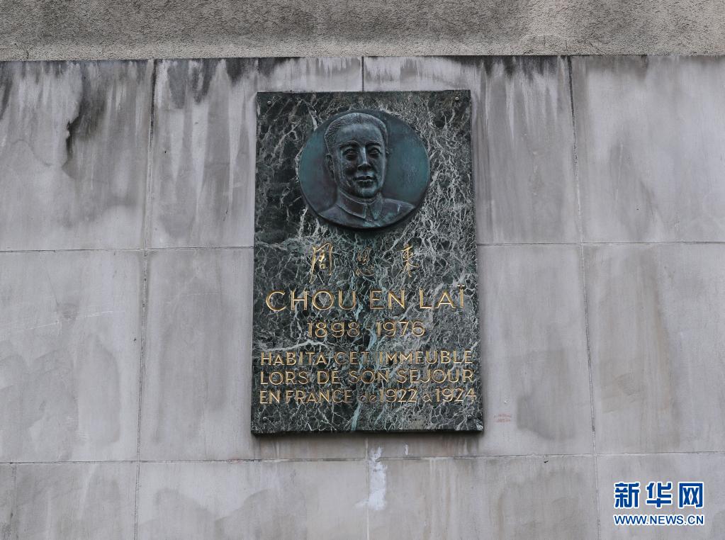 这是4月11日在法国巴黎十三区戈德弗鲁瓦街上的“海王星旅馆”外拍摄的周恩来头像的青铜纪念牌。1920年,22岁的周恩来从上海启程赴法。他在1922年至1924年期间曾住在这家小旅馆。 新华社记者 高静 摄