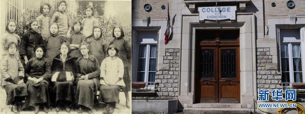拼版照片显示的是(左)中国旅法勤工俭学的女学生在蒙达尔纪女子公学合影留念(拍摄日期为1920至1921年间);(右)2021年5月7日拍摄的法国蒙达尔纪杉松中学。杉松中学曾是蒙达尔纪女子公学,1920年起,向警予、蔡畅等中国勤工俭学青年中的女学生曾在这里学习生活。 新华社记者 高静 摄