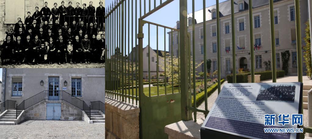 拼版照片显示的是法国蒙达尔纪男子公学。其中左上为男子公学资料照片,左下为男子公学现状(摄于2021年5月7日),右为男子公学(现为蒙达尔纪市政厅)及门前的“伟大的足迹”中法双语指示牌(摄于2021年4月8日)。1913至1925年间,几百名中国青年学生在此住宿和学习,蔡和森、陈毅等曾在此就读。 新华社记者 高静 摄