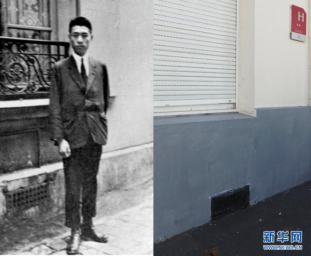 拼版照片显示的周恩来旅法期间在旅馆前留影的资料照片(左)和拍照地点现状(拍摄于2021年4月25日)。1920年,22岁的周恩来从上海启程赴法。他在1922年至1924年期间曾住在这家小旅馆。 新华社记者 高静 摄
