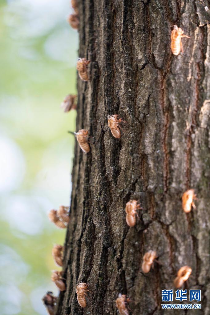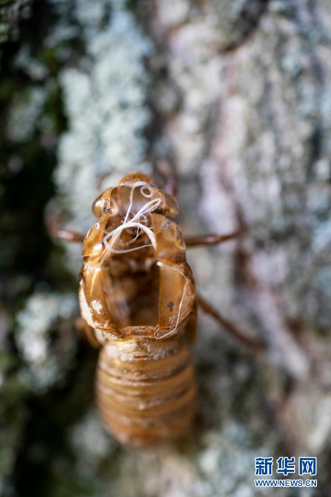 这是5月19日在美国弗吉尼亚州阿灵顿拍摄的17年蝉的蝉蜕。 近日,亿万只17年蝉开始破土而出,现身美国东部和中西部部分地区。17年蝉是周期蝉的一种。周期蝉是世界上最长寿昆虫之一,它们一生大部分时间以蛹的形态在地下生活,以树根为食,不同种类蛰伏时间为13年或17年。一旦破土而出,周期蝉只能存活2周到4周时间,交配并产卵后就会死去。 新华社记者 刘杰 摄