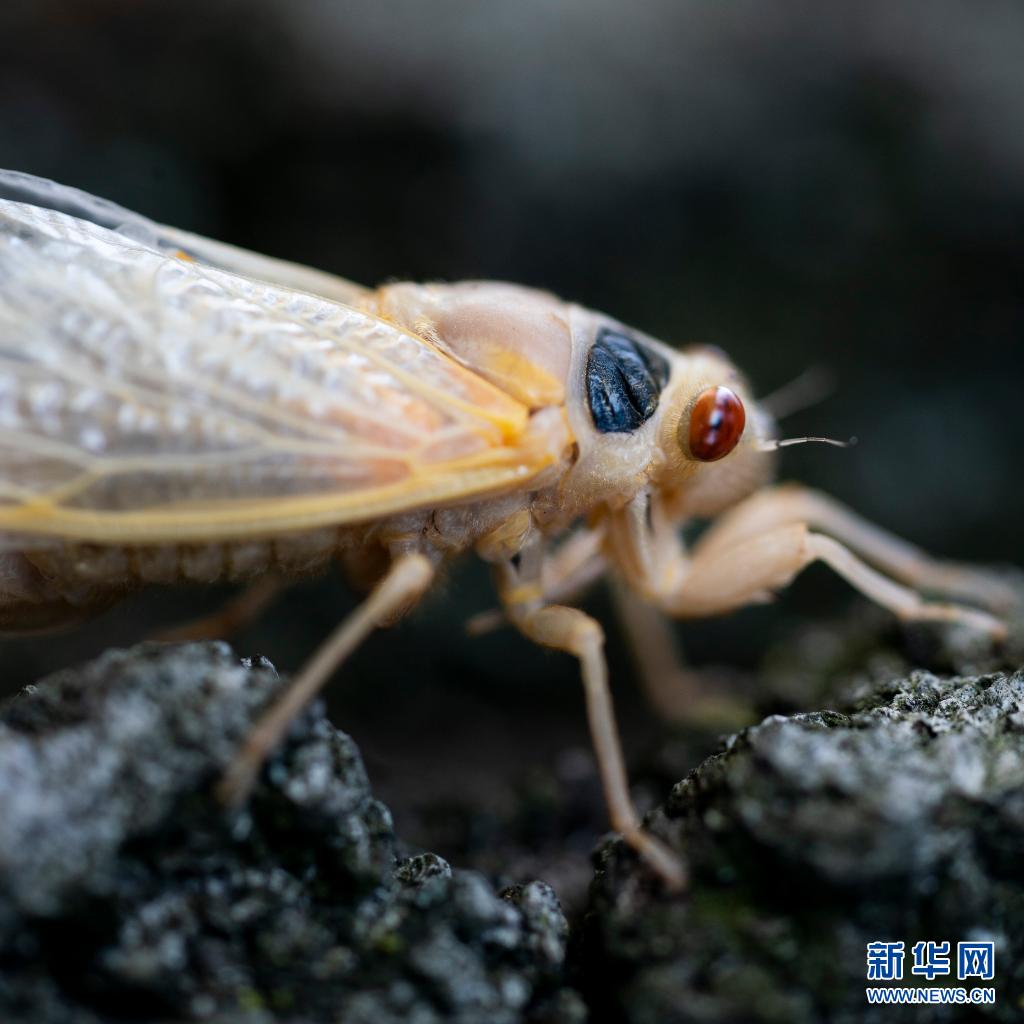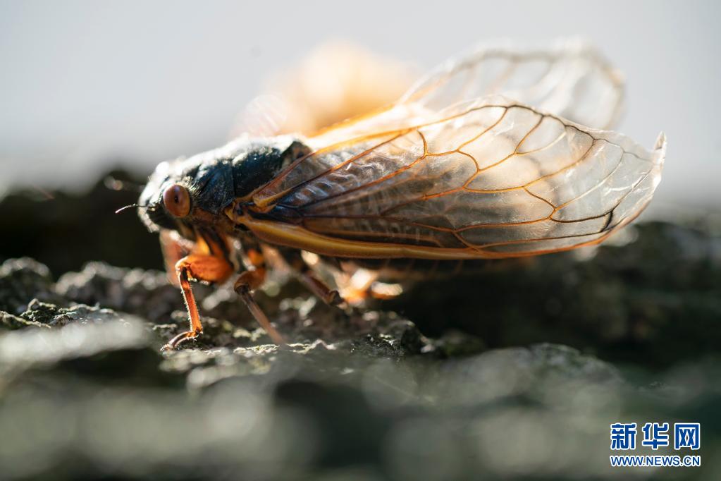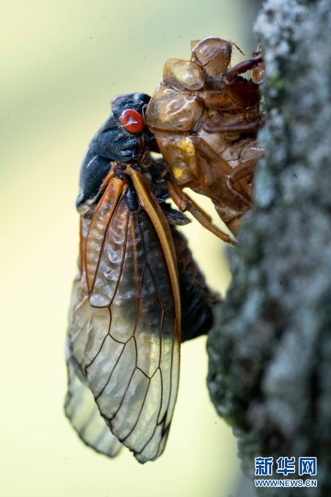 这是5月18日在美国弗吉尼亚州阿灵顿拍摄的17年蝉。 近日,亿万只17年蝉开始破土而出,现身美国东部和中西部部分地区。17年蝉是周期蝉的一种。周期蝉是世界上最长寿昆虫之一,它们一生大部分时间以蛹的形态在地下生活,以树根为食,不同种类蛰伏时间为13年或17年。一旦破土而出,周期蝉只能存活2周到4周时间,交配并产卵后就会死去。 新华社记者 刘杰 摄