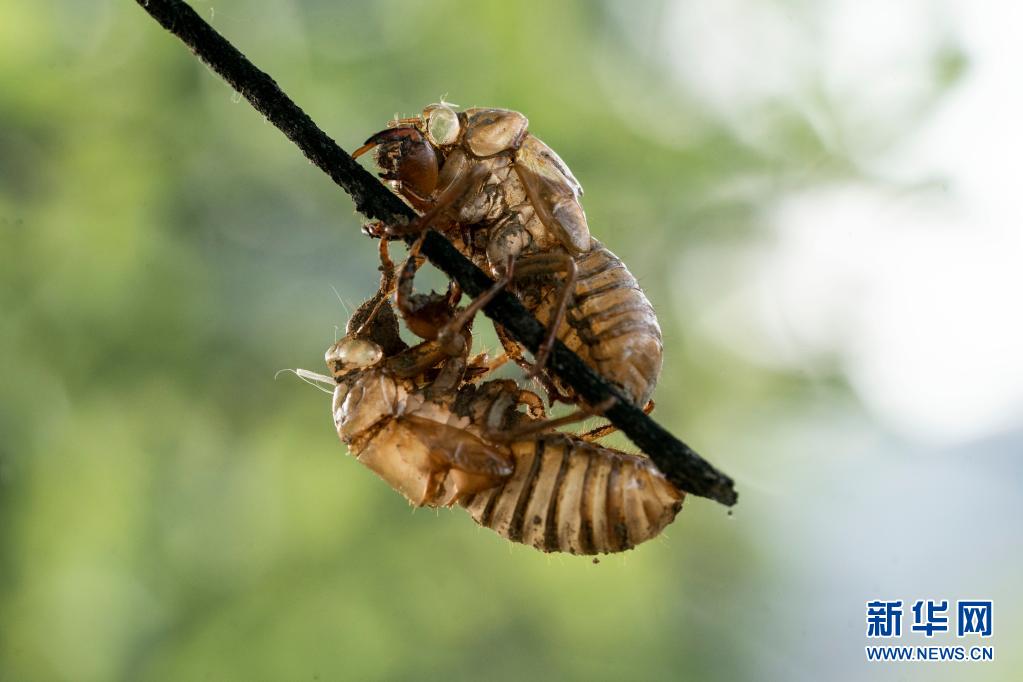 这是5月18日在美国弗吉尼亚州阿灵顿拍摄的17年蝉和蝉蜕。 近日,亿万只17年蝉开始破土而出,现身美国东部和中西部部分地区。17年蝉是周期蝉的一种。周期蝉是世界上最长寿昆虫之一,它们一生大部分时间以蛹的形态在地下生活,以树根为食,不同种类蛰伏时间为13年或17年。一旦破土而出,周期蝉只能存活2周到4周时间,交配并产卵后就会死去。 新华社记者 刘杰 摄