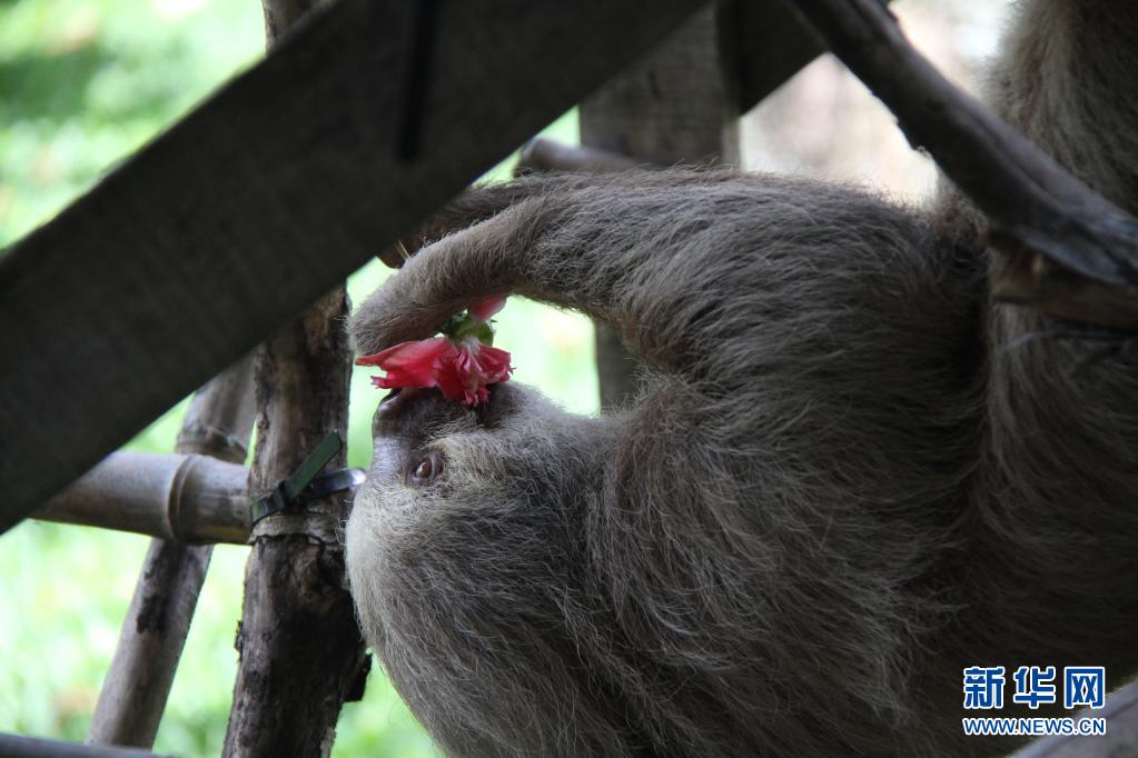 4月20日,树懒“拉蒂”在位于哥斯达黎加埃雷迪亚的“巨嘴鸟救助牧场”享用它的“鲜花早餐”。