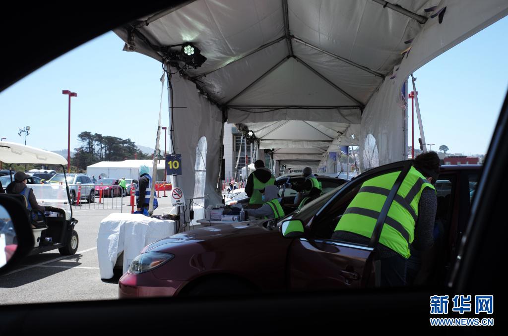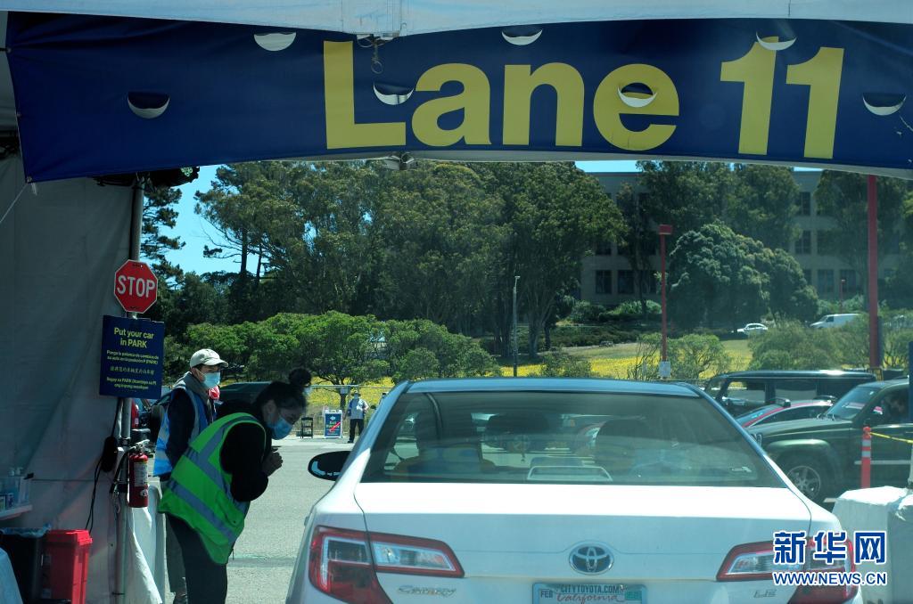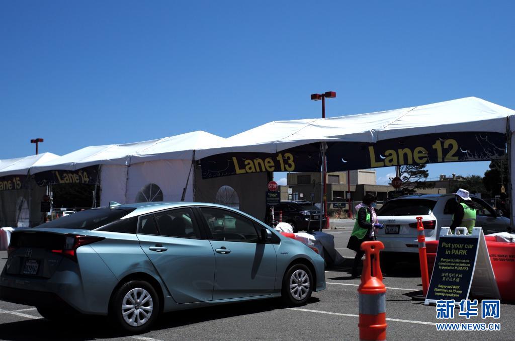 5月22日,在美国加利福尼亚州旧金山城市学院的新冠疫苗接种点,市民通过“得来速”的方式不下车接种疫苗。新华社记者 吴晓凌 摄