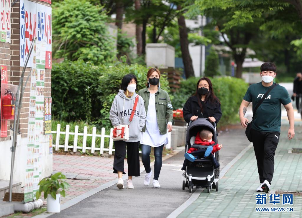 5月21日,戴口罩的市民走在韩国首尔的街道上。 当日,韩国政府宣布将现行的首都圈2级、非首都圈1.5级的防疫响应级别与禁止5人及以上聚集的防疫措施再延长三周至6月13日。新华社记者 王婧嫱 摄